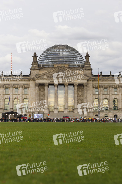 Im Bild die Demo von staatenlos.info am Reichstag. Demonstranten verschiedener Gruppierungen wie etwa der Initiative Querdenken 711 protestierten mit einer Großdemonstration in Berlin gegen die bestehenden Maßnahmen zur Eindämmung der Corona-Pandemie. Wegen Nichteinhaltung der polizeilichen Auflagen wurde die Demonstration durch die Polizei beendet. Es gab Rangeleien und Festnahmen. Berlin, 29.08.2020