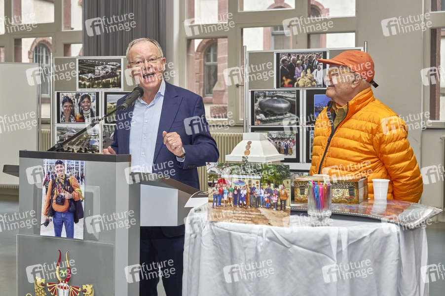 Stephan Weil und Hassan Mahramzadeh bei der Auszstellungseröffnung '25 Jahre EXPO 2000 - Bilder einer Weltausstellung' von Hassan Mahramzadeh unter der Schirmherrschaft von Ministerpräsident a.D. Stephan Weil im Bürgersaal vom Neuen Rathaus. Hannover, 26.10.2025