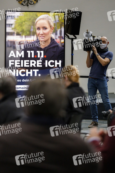 Motive der Corona-Kampagne mit Janine Kunze auf der Corona-Pressekonferenz im Kölner Rathaus. Der Kölner Karneval wird wegen der rasant steigenden Infektionszahlen nicht iwie gewohnt stattfinden: In einer gemeinsamen Erklärung verkündeten Stadt und Festkomitee, dass am 11.11. im Kölner Stadtgebiet ein Alkoholverbot gelte, zudem solle die Kampagne '11.11. und Karneval in Zeiten von Corona' starten. Köln, 27.10.2020
