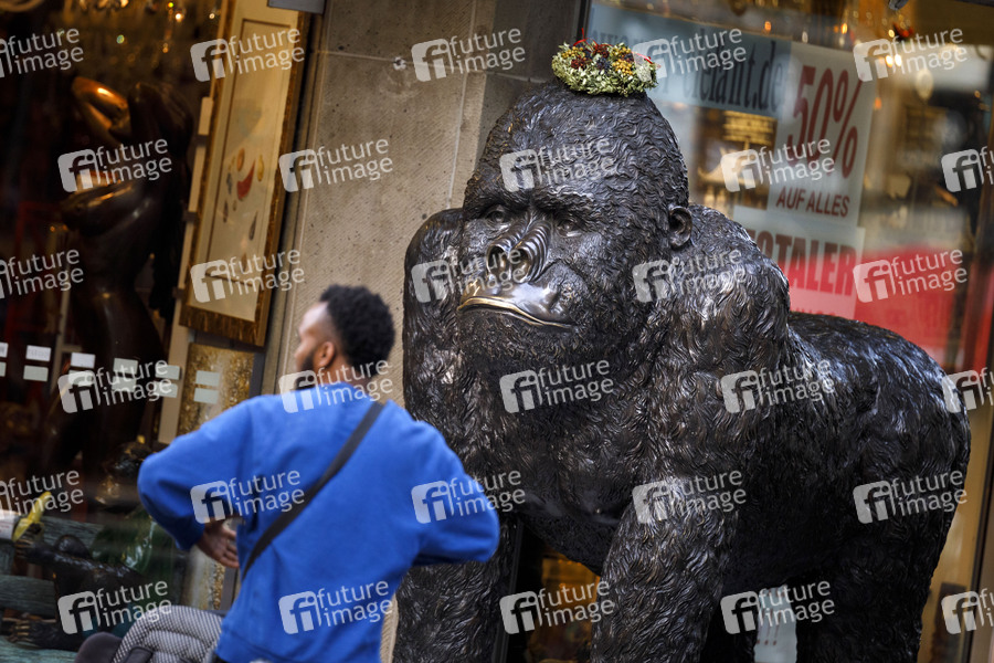 Ein Gorilla, der Vorfahre der Menschen, steht als Bronze-Figur vor einem Souvenirladen in der Altstadt. Köln, 18.06.2019