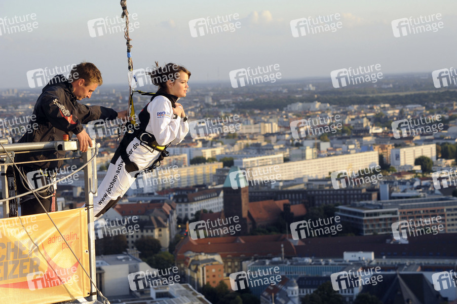 Base Flying von Jochen Schweizer mit den Hauptdarstellern von 'Gangs' auf dem Park Inn Hotel am Alexanderplatz in Berlin