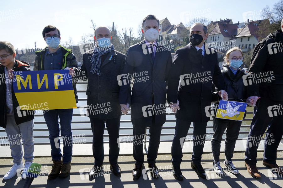Initiiert vom Görlitzer Augustum-Annen-Gymnasium fanden sich ca. 1.000 Menschen zu einer grenzüberschreitenden Menschen-Kette zusammen, ausgehend von der Altstadtbrücke in beide Richtungen nach Zgorzelec und Görlitz. Mit dabei waren der Görlitzer Oberbürgermeister Octavian Ursu, sein Zgorzelecer Amtskollege Rafal Gronicz und Marcin Król, der Konsul der Republik Polen in Berlin. Görlitz, 09.03.2022