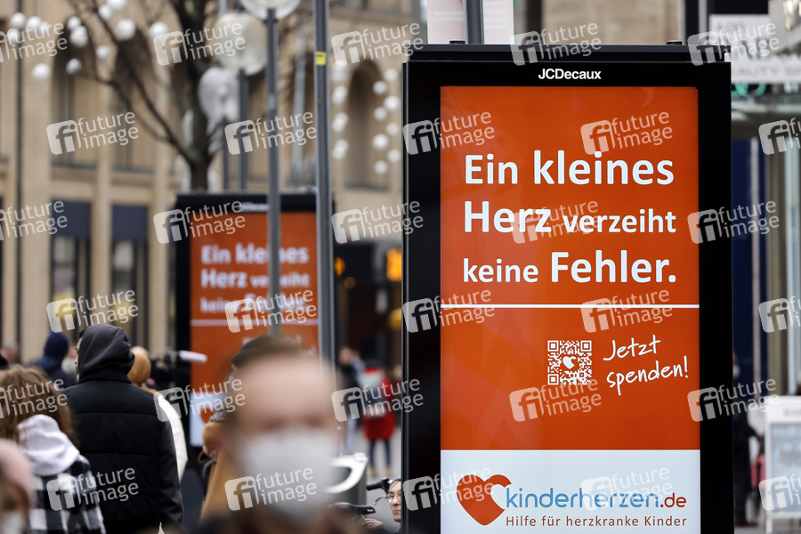 Auf Plakaten in der Einkaufszone Schildergasse wirbt die Fördergemeinschaft Deutsche Kinderherzzentren e.V. (kinderherzen.de) mit dem Spruch 'Ein kleines Herz verzeiht keine Fehler' um Spenden für ihre Hilfsprojekte für herzkranke Kinder. Köln, 10.02.2022