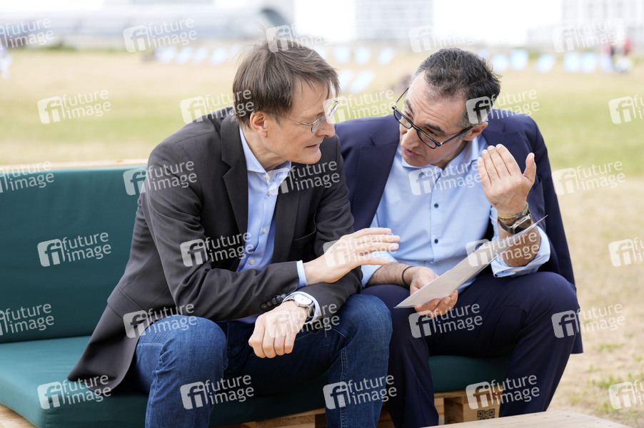 Karl Lauterbach und Cem Özdemir im Gespräch zum Cannabisgesetz beim Demokratiefest zu 75 Jahren Grundgesetz zwischen Kanzleramt und den Deutschen Bundestag. Berlin, 25.05.2024