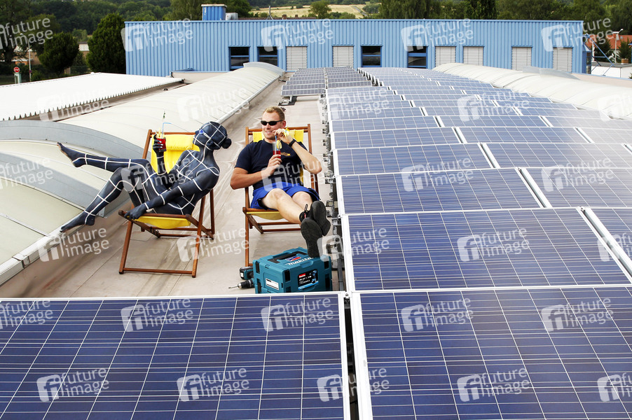 Solardach-Pflicht, Solarpflicht, Klimaschutz-Sofortprogramm 2022, Energie-Standard EH-55, Energie, Solarstrom, Solarzelle, Photovoltaik, Solarpanele, Solarenergie, Sonnenenergie, Solaranlage, Dach, Solarmodule, Nachhaltigkeit, Erneuerbare Energien, Energiewende, Solarzellen, Klima, Umwelt, Ökostrom, Umweltschutz, Body-Painting, Akt, Körperkunst, Körperfarben, Farbe, Bemalung, Kunst, Malerei, Beruf, Solarteur, Strom, Symbolfoto, Symolbild, Model Release