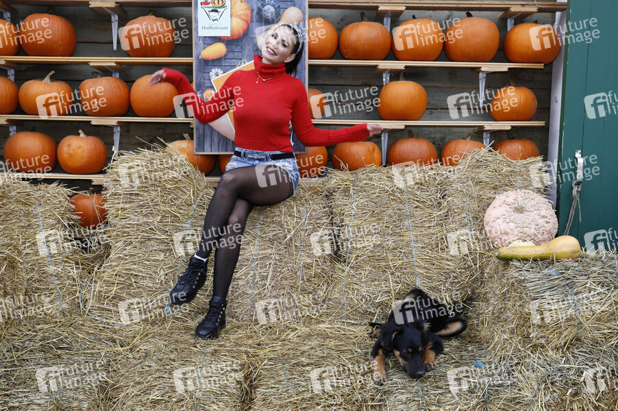 Prominenz, Celebrity, Celebrities, Fotoshooting, Fototermin, Unterhaltung, Entertainment, Halloween, Kürbis, Partyvorbereitungen, Bauernhof, Model, Moderatorin