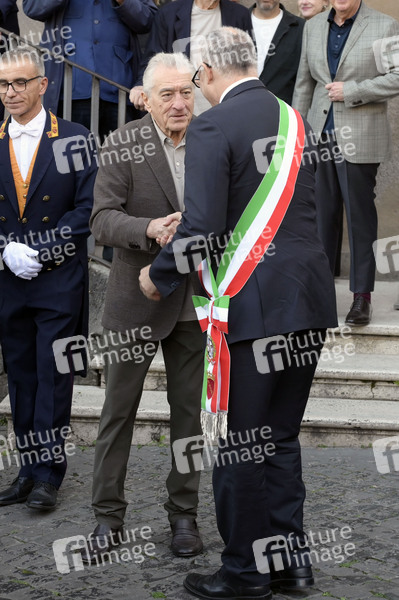 Robert de Niro und Roberto Gualtieri nach der Verleihung des Lupa Capitolina auf dem Kapitolsplatz. Rom, 06.11.2025
