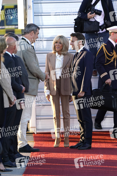 Markus Söder und Emmanuel Macron mit Ehefrau Brigitte Macron bei der Ankunft von Präsident Macron zum G7-Gipfel am Flughafen München Franz Josef Strauß. München, 25.06.2022
