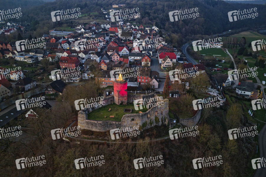 Advent, Adventszeit, Weihnachtszeit, Weihnachten, Christmas, X-Mas, Kerze, Riesenkerze, Weserbergland, Eversteiner Burg, Sehenswürdigkeit an der Weser, Ruine, Höhenburg, Luftaufnahme, Drohnenaufnahme