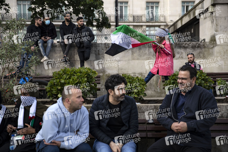 Tausende Menschen bei einem Protestmarsch, organisiert von pro-palästinensischen Organisationen. Viele Teilnehmer trugen Palästina-Fahnen und 'Free Palestine'-Banner. Ein Sprecher der Gruppe forderte die britische Regierung auf, ihre militärische, diplomatische und finanzielle Unterstützung für Israel umgehend einzustellen. London, 21.03.2021