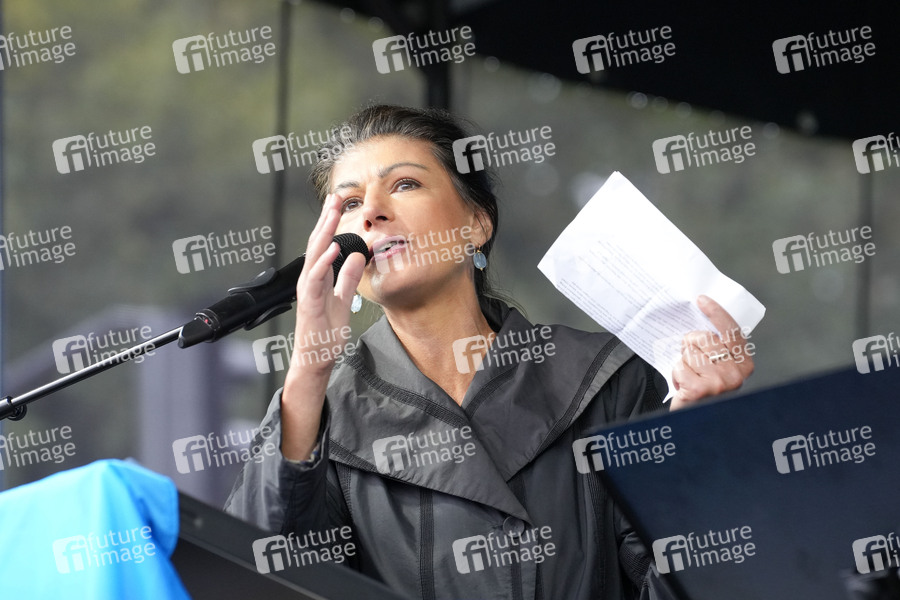 Sahra Wagenknecht bei der Friedensdemonstration unter dem Motto 'Nein zu Krieg und Hochrüstung! Ja zu Frieden und internationaler Solidarität' vor der Siedessäule am Großen Stern. Berlin, 03.10.2024