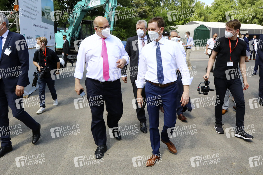 Peter Altmaier und Michael Kretschmer beim Besuch des Fraunhofer Hydrogen Lab Görlitz auf dem Innovationscampus von Siemens Energy in Görlitz. Zur Stärkung der Strukturentwicklung stellen Bund und Freistaat Sachsen gemeinsam eine Förderung in Höhe von 42 Millionen Euro zur Verfügung. Görlitz, 17.06.2021