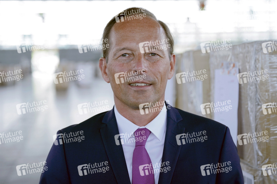 Thomas Wessel (Vorstandsmitglied und Arbeitsdirektor Evonik Industries AG) beim Besuch im Landeslager für Schutzausrüstung an der Messe. Düsseldorf, 03.06.2020