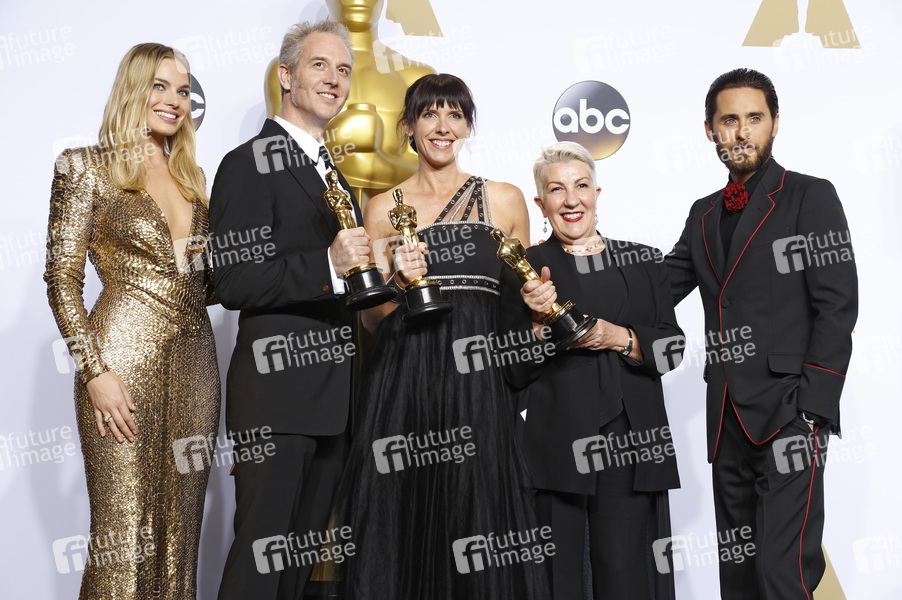 Margot Robbie mit Damian Martin, Elka Wardega und Lesley Vanderwalt (Bestes Make-up und beste Frisuren in 'Mad Max: Fury Road') und Jared Leto im Presseraum der Oscar Verleihung 2016 / 88th Academy Awards im Loews Hollywood Hotel. Los Angeles, 28.02.2016