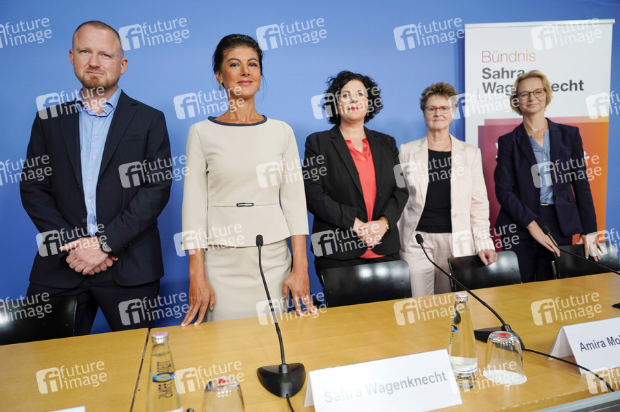 Christian Leye, Sahra Wagenknecht, Amira Mohamed Ali, Katja Wolf und Sabine Zimmermann bei der Pressekonferenz des BSW nach den Landtagswahlen in Thüringen und Sachsen. Berlin, 02.09.2024