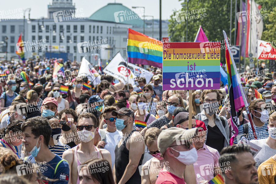 Mehrere tausend Teilnehmer der LGBTIQ-Community nehmen an der 'Berlin Pride 2020' unter dem Motto 'Save our Community, Save our Pride'. Die Demonstration wurde von Nasser EL-Ahmad angemeldet, da die ursprüngliche Demonstration zum Christopher Street Day im Juli wegen der Corona-Pandemie ausschließlich digital stattfinden wird. Berlin, 27.06.2020