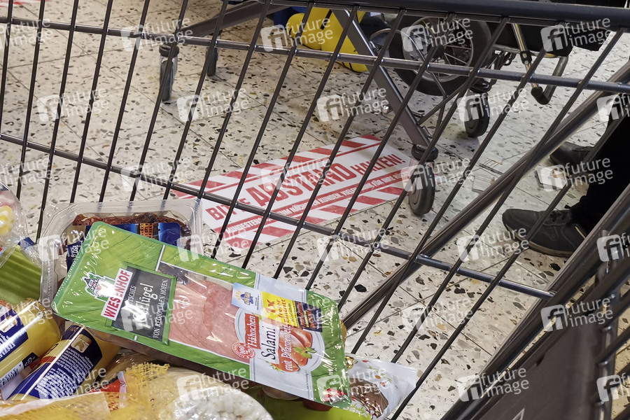Einkaufen, Supermarkt, Einkaufswagen, Rücksicht, Abstand halten, Virenschutz, Ausbreitung, Lock Down, Lockdown, Öffentlichkeit, Eindämmung, Seucheneindämmung, anstecken, infizieren, Vorbeugung, Prävention, schützen, Schutz, Kontaktverbot, Kontakt-Verbot, Einschränkung, Verzicht, Mindestabstand, Eindämmung, Seuchenschutz, Corona-Schutz, Virus, Viren, Corona, Sars-CoV-2, Covid-19, Coronavirus, Coronaviren, Corona-Virus, Corona-Viren, Ansteckung, Ansteckungsgefahr, Epidemie, Pandemie, Infektion, Infektionen, Social Distancing, Coronakrise, Corona-Krise, Coronamaßnahmen, Corona-Schutz, flatten the curve, Ausnahmesituation, Zeitgeschichte, Übertragung, Prävention, Corona-Regeln, Corona-Maßnahmen, Symbolfoto, Symbolbild
