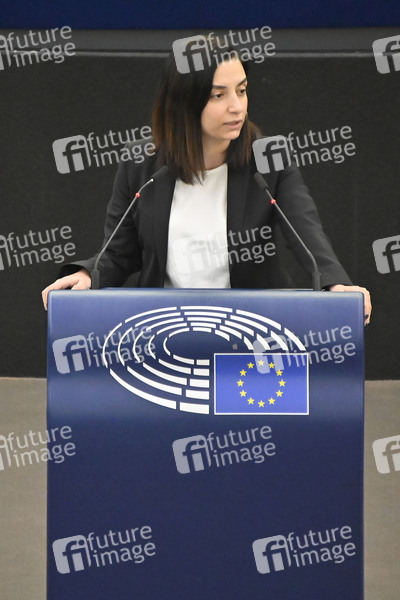 Evin Incir bei einer Plenartagung zur Zusammenarbeit und Gemeinsamkeiten des Putin-Regimes und rechtsextremer sowie separatistischer Bewegungen in Europa im Plenarsaal des Europäischen Parlaments. Straßburg, 06.04.2022