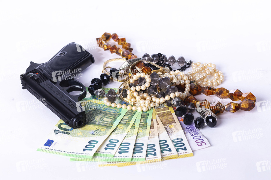 Überfall, Geld, Ersparnisse, Banknoten, Geldscheine, Vermögen, Euro, Geldschein, €, Einbruch, Einbrecher, Dieb, Diebstahl, Straftat, Waffe, Pistole, Walther PPK, Täter, Opfer, Raubstraftat, Raub, Ausrauben, Angriff, Schmuck, Symbolbild, Themenbild