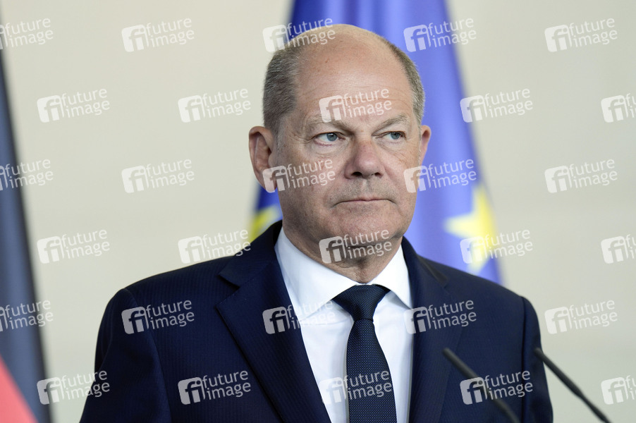 Olaf Scholz beim Empfang der Bundespräsidentin der Schweiz mit militärischen Ehren und zu einem gemeinsamen Gespräch mit anschließendem Pressestatement im Bundeskanzleramt. Berlin, 15.05.2024