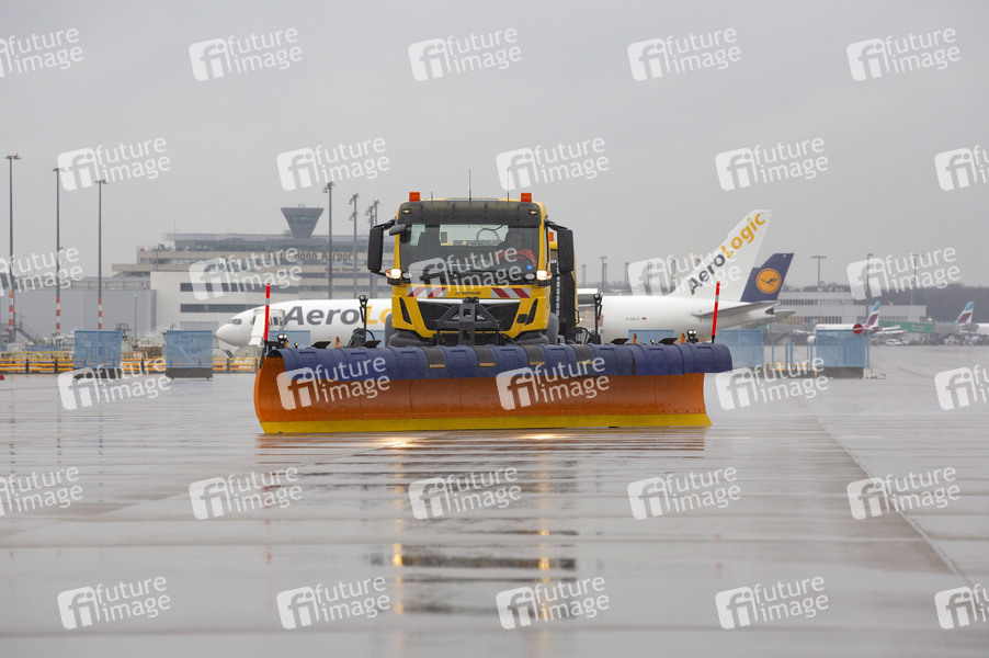 Winterdienst-Saison, Kehrblasgeräte, Schneeschild, Flächenenteisung, Landebahn, Startbahn, Lande- und Startbahn, Aviation, Flugzeuge, Winter, Eis, Schnee, Hightech-Fahrzeuge, Flotte, Sprühfahrzeug, Winterdienst-Container, Regen, Schlechtes Wetter, Minusgrade, Temperaturfall