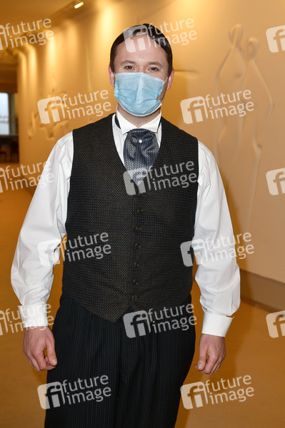 Frederic Brossier beim Fototermin mit dem (getesteten) Ensemble des Theaterstücks 'Vorhang auf für Cyrano' in Maske und Kostüm vor dem Testzentrum im Schiller Theater. Unter dem Motto 'Testen statt spielen' eröffnen die Komödie am Kurfürstendamm und der KitKatclub ein gemeinsames Testzentrum im Schiller Theater. Berlin, 07.04.2021