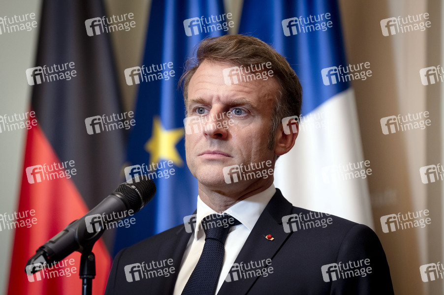 Emmanuel Macron beim Empfang des französischen Staatspräsidenten zu einem gemeinsamen Gespräch mit dem Bundeskanzler mit anschließendem Pressestatement in der Borsig-Villa am Tegeler See. Berlin, 23.07.2025