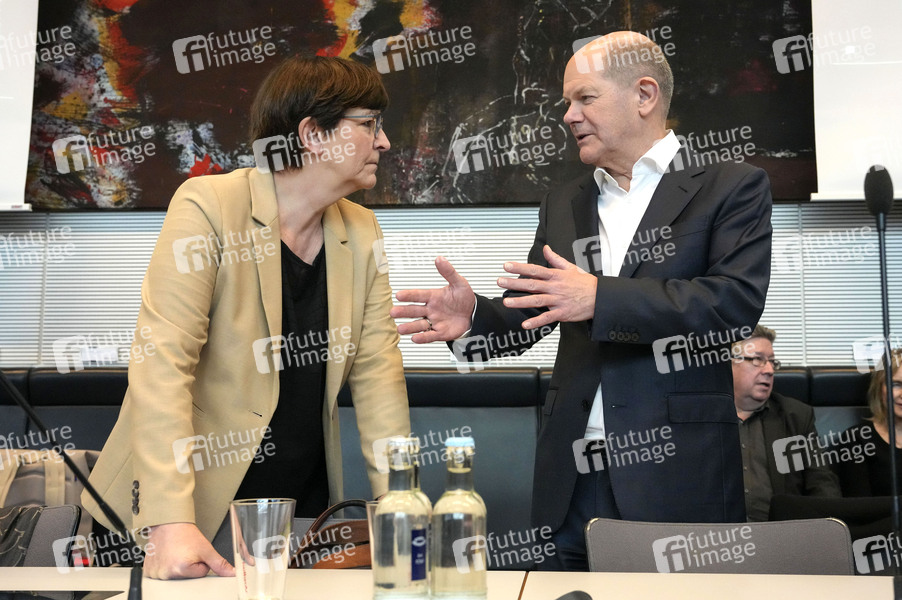Saskia Esken und Olaf Scholz bei der Fraktionssitzung der SPD-Bundestagsfraktion im Reichstagsgebäude. Berlin, 12.03.2024
