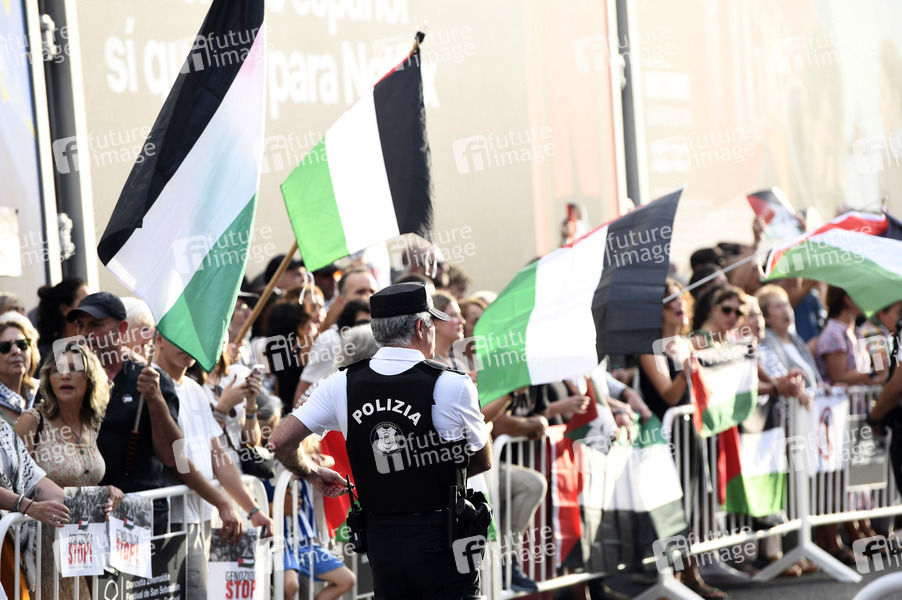Anti-Israel-Demo, Demonstration, Protest, Filmpremiere, Premiere, Kino, Film, Eröffnung, Opening Ceremony, Eröffnungsgala, Roter Teppich, Ankunft, Unterhaltung, Entertainment, Kultur, Filmfest, Internationales Filmfestival, SSIFF, 73rd San Sebastian International Film Festival, Donostia Zinemaldia - Festival de San Sebastián