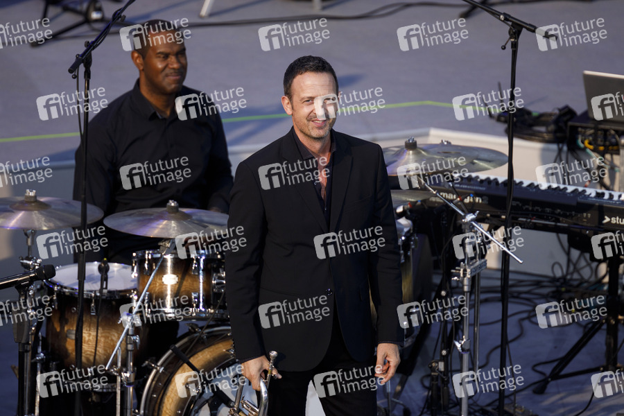 Till Brönner mit Band beim Festakt zum 75. Geburtstag des Landes Nordrhein-Westfalen auf der Düsseldorfer Galopprennbahn. Düsseldorf, 23.08.2021