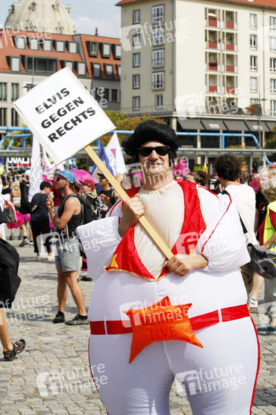 Demonstranten verschiedener Gruppen protestieren unter dem Motto 'Unteilbar: Für eine offene und freie Gesellschaft - Solidarität statt Ausgrenzung' gegen Rassismus, für soziale Gerechtigkeit und gegen Ausgrenzung am Altmarkt. Dresden, 24.08.2019