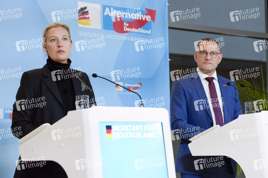 Alice Weidel und Tino Chrupalla beim Pressestatement zur Fraktionssitzung der AfD-Bundestagsfraktion im Reichstagsgebäude. Berlin, 03.12.2024