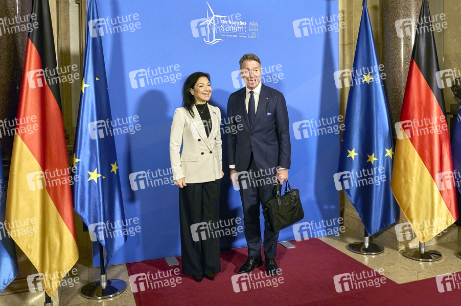 Katherina Reiche (Bundesministerin für Wirtschaft und Energie) und Terje Aasland (Minister für Energie, Norwegen) beim 3. internationalen Nordsee-Gipfel 2026 auf Ebene der Regierungschefinnen und -chefs sowie der Energieministerinnen und Energieminister im Rathaus. Ziel des Gipfels ist es, den grenzüberschreitenden Ausbau der Offshore-Windenergie, den Wasserstoffmarkt und zugleich eine leistungsfähige und vernetzte Offshore-Infrastruktur im gesamten Nordseeraum weiter voranzutreiben. Hamburg, 26.01.2026