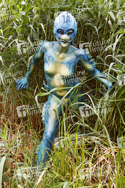 Bodypainting, Body-Painting, Erotik, Frau, Mädchen, nackt, Akt, weiblich, Körperkunst, Körperfarben, Farbe, Bemalung, Kunst, Malerei, Meer, See, Gewässer, Wasser, Monster, Ungeheuer, Fischwesen, Monster aus der Lagune, Schilf, Science Fiction, Sci-Fi, SciFi, Fantastic, Creature from the Black Lagoon, body painting, erotic, woman, girl, nude, female, body art, colors, sea, reed, lake, water, monster, fish being