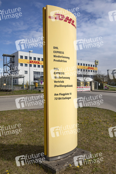 Informationstafel und Hauptgebäude DHL-Frachtpostzentrum. (Symbolbild, Themenbild) Eutingen im Gäu, 11.04.2021