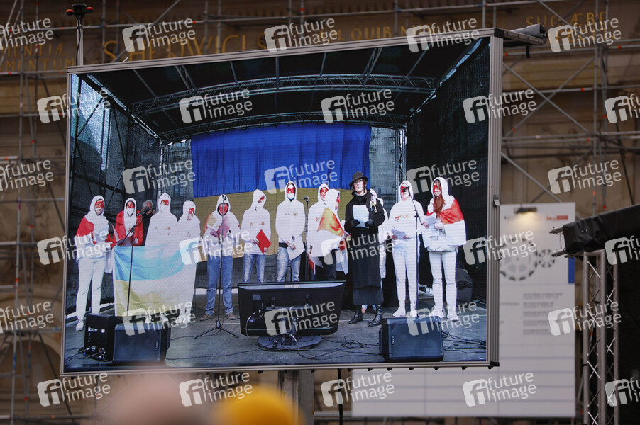 Der Volny Chor aus Belarus beim Solidaritätsaufruf 'Call for Solidarity with Ukraine' des Internationalen Literaturfestivals Berlin auf dem Bebelplatz. Berlin, 06.03.2022