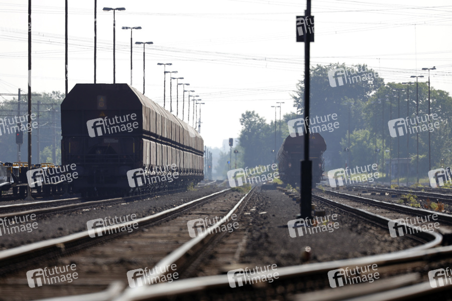 Güterwagons auf einem Rangiergleis am Bahnhof Frechen. Fotografiert aus dem öffentlichen Raum. (Themenbild, Symbolbild) Frechen, 14.06.2021