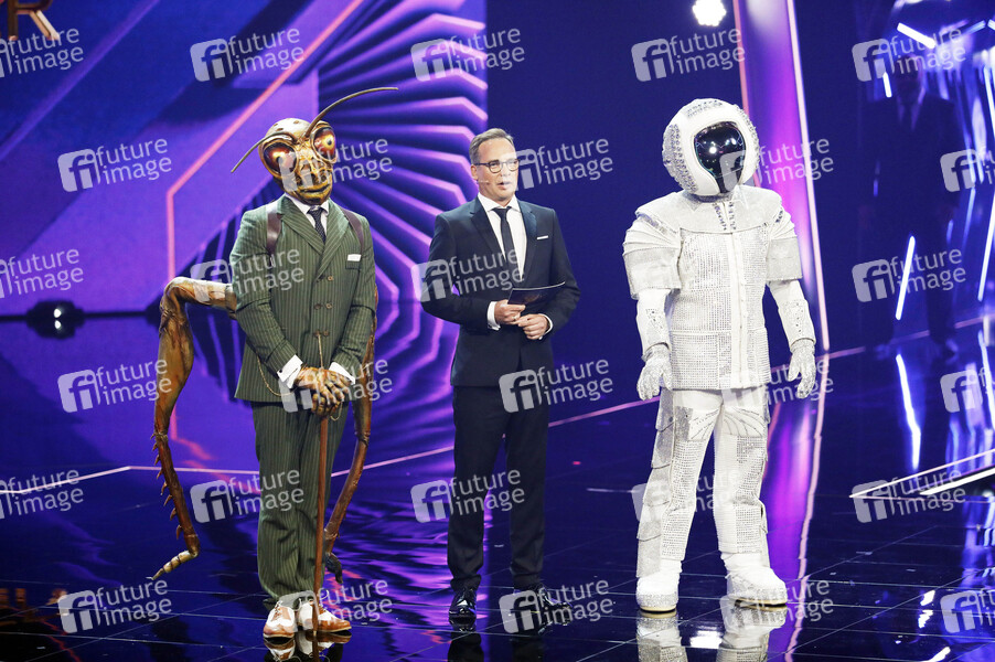 Gil Ofarim als Grashüpfer, Matthias Opdenhövel und Max Mutzke als Astronaut im Finale der Live Show 'The Masked Singer' in den MMC Studios Köln-Ossendorf. Köln, 01.08.2019