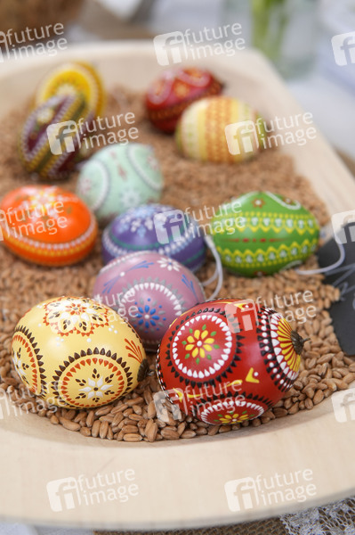 Sorbische Ostereier von Kugelei.com. Das Gelbe vom Ei - kunsthandwerklicher Ostermarkt auf dem Karl-August-Platz in Charlottenburg (Symbolfoto, Themenfoto). Berlin, 24.03.2024