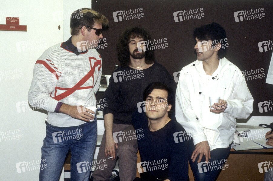 John Lees, Les Holroyd, Rudi Keuntje und Woolly Wolstenholme von Barclay James Harvest bei den Dreharbeiten zum Musikvideo von 'Victims of Circumstance' in den Ewart Studios. London, 28.03.1984