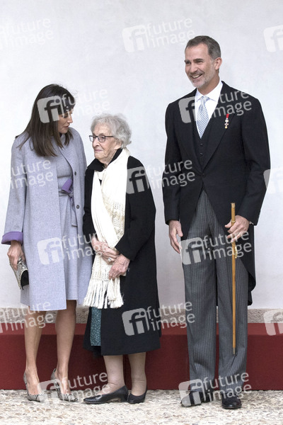 Königin Letizia von Spanien, Ida Vitale und König Felipe VI. von Spanien bei der Verleihung des Premio Miguel de Cervantes an Ida Vitale in der Universidad de Alcalá. Alcalá de Henares, 23.04.2019