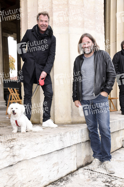 Patrick Lindner mit Hund Obelix und Roland Hefter bei der Kundgebung 'Aufstehen für Kultur' auf dem Königsplatz. München, 24.10.2020