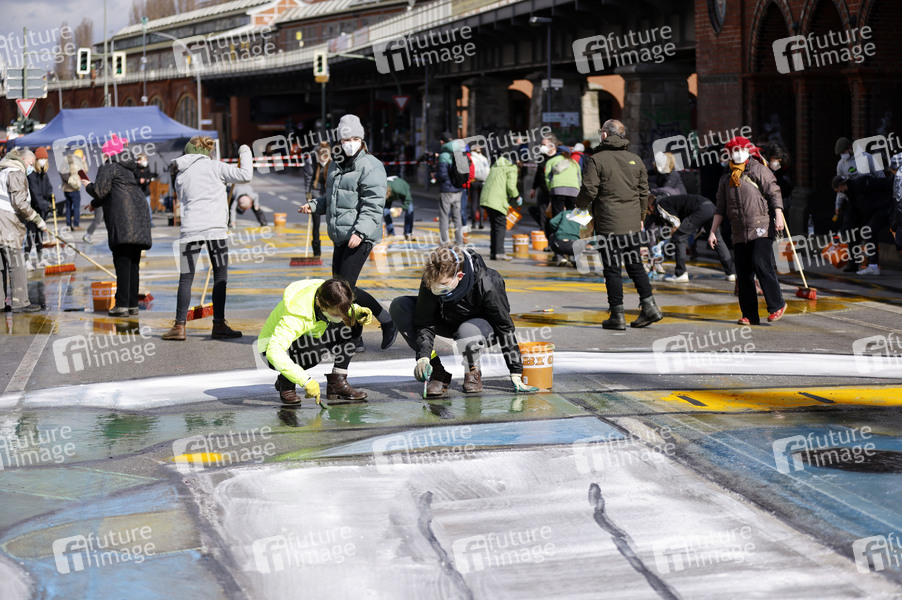 Am Freitag finden mehrere Demonstrationen zum globalen Klimastreik von Fridays for Future in Berlin statt. An der Oberbaumbrücke bemalen Aktivisten die Straße zum Thema 'Another World is possible'. Berlin, 19.03.2021