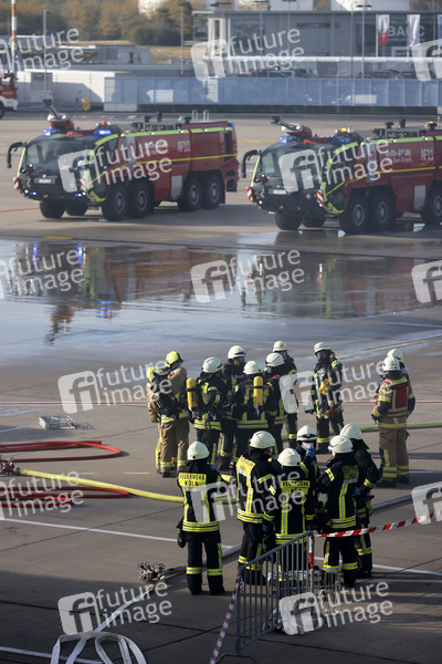 Einsatzkräftei der gemeinsamen ICAO-Notfallübung der Werkfeuerwehr, der Feuerwehr Köln, THW, Landespolizei, Bundespolizei und Bundeswehr am Köln Bonn Airport. Im Rahmen der Übung wird die Kollision eines Flugzeugs mit einem Passagierbus und einer Abfertigungshalle simuliert. Einsatzkräfte retten Verletzte aus dem in Brand geratenen Flugzeug. Köln, 06.11.2021