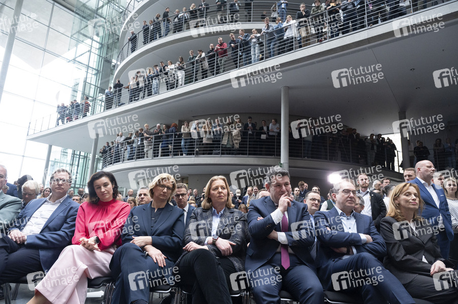 Dorothee Bär, Anke Rehlinger, Bärbel Bas, Hubertus Heil und Alexander Dobrindt bei der Pressekonferenz von CDU, CSU und SPD zur Vorstellung des gemeinsamen Koalitionsvertrages im Paul-Löbe-Haus. Berlin, 09.04.2025