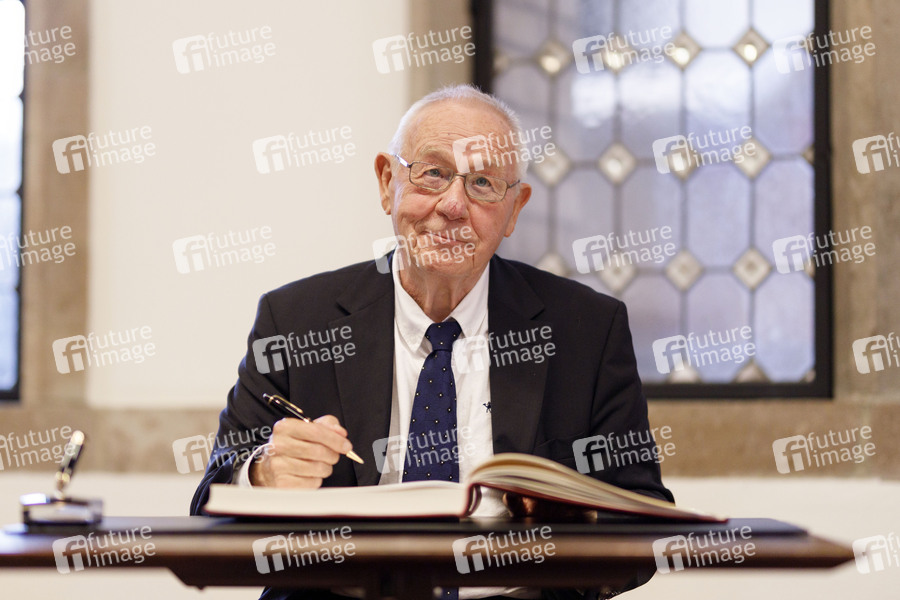 Armin Maiwald beim Eintrag ins Gästebuch - Oberbürgermeisterin Henriette Reker ehrt den Vater der 'Sendung mit der Maus' zu seinem 80. Geburtstag im historischen Rathaus. Köln, 13.08.2020