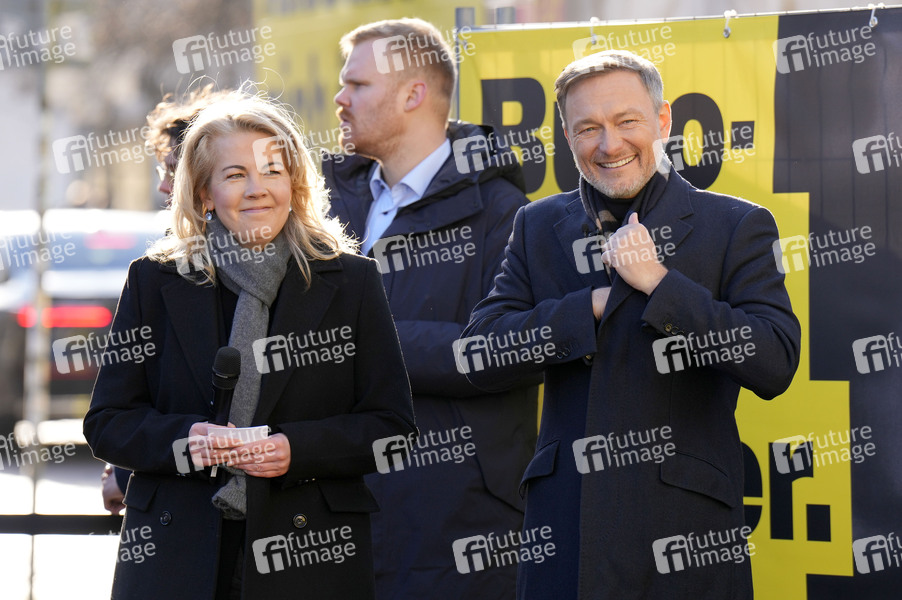 Linda Teuteberg und Christian Lindner beim Wahlkampfauftakt der FDP zur Bundestagswahl 2025 auf dem Luisenplatz. Potsdam, 08.01.2025