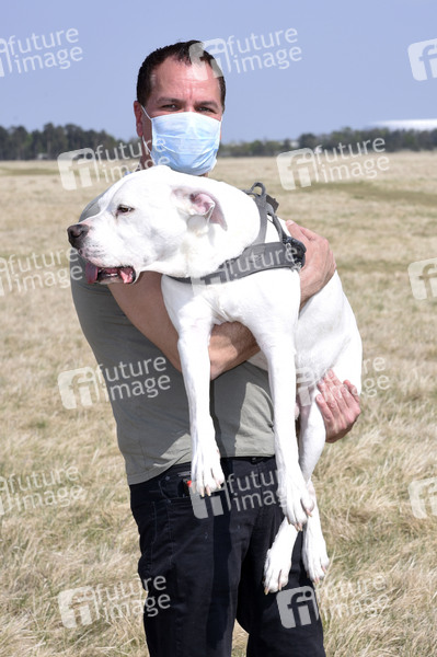 Dave Kaufmann mit seinem Hund Dean Martin bei einem exklusiven Fototerin während eines Spaziergangs. München, 17.04.2020