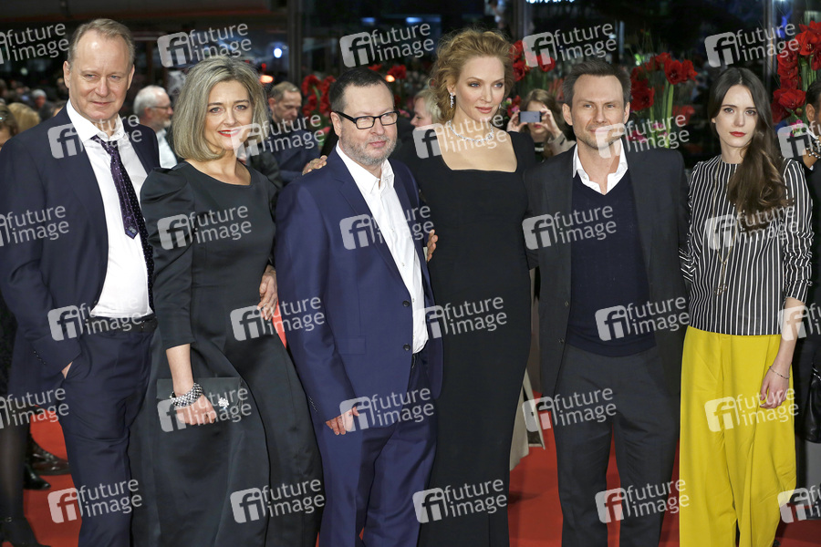 Stellan Skarsgard, Lars von Trier mit Partnerin Bente Froege, Uma Thurman, Christian Slater und Stacy Martin bei der Premiere von 'Nymphomaniac: Volume I' auf der Berlinale 2014 / 64. Internationale Filmfestspiele Berlin, 09.02.2014