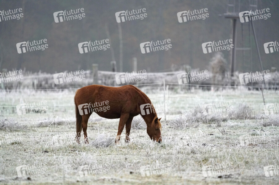Frost, Futter, Gras, Koppel, Natur, Pferd, Pony, Raureif, Reif, Tier, Weide, weiß, Wetter, Winter, Nebel, Pferd, Pferde, Zaun, Koppelzaun, Jahreszeit, Symbolfoto, Symbolbild